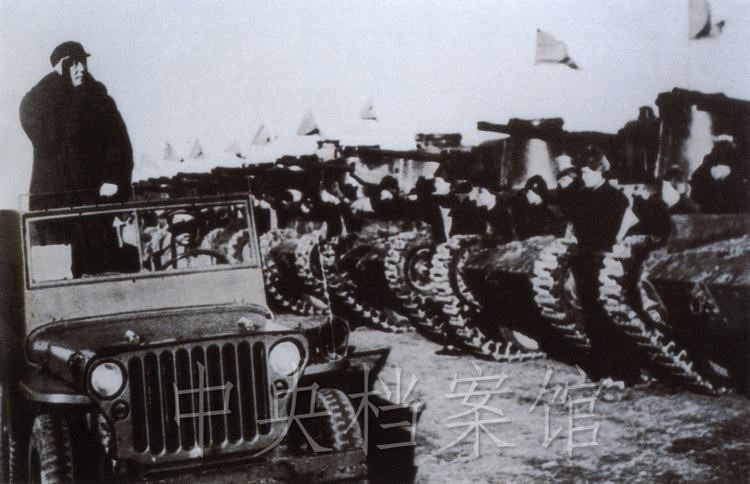 紀錄片:(群眾呼聲)中國人民萬歲?。o錄片解說)檢閱開始了。東北野戰(zhàn)軍參謀長劉亞樓將軍,向毛主席報告受檢閱的部隊全部到齊。坦克塔上飄揚著紅旗,坦克手精神百倍,向著自己的領袖敬禮。
